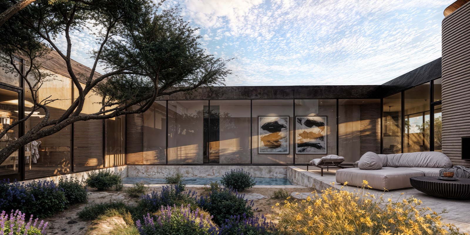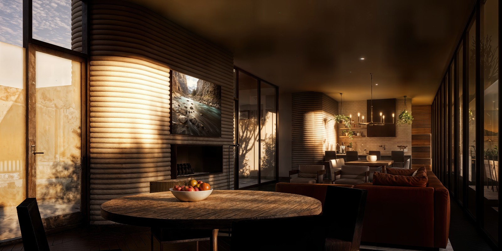 More than a residence, the project operates as a continuous negotiation between technology and ground. Additive construction is not presented as an aesthetic stamp, but as a tectonic process that reshapes how enclosure, structure, and surface become one. The printed walls do not hide their making. They reveal it as texture, rhythm, and form. Landscape and architecture interlock as a single system where desert planting, stone, shadow, and wall surface merge into a unified field. The house becomes neither object nor shelter alone, but a constructed terrain for living.