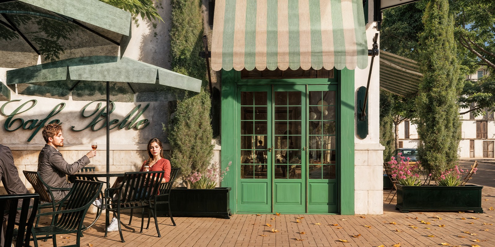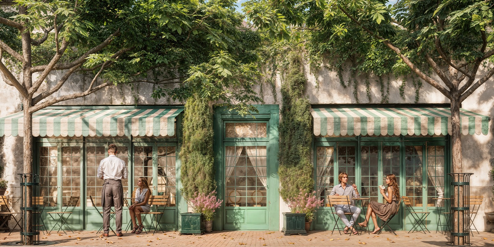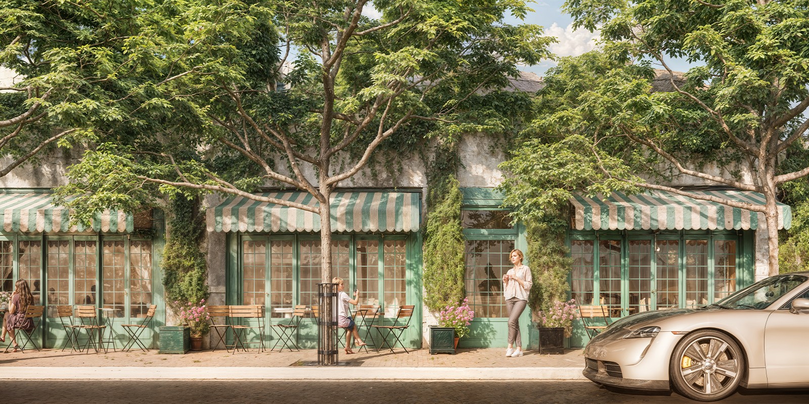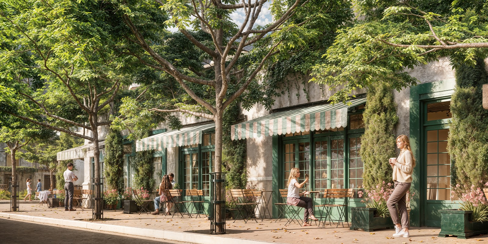 Along the sidewalk, the building opens itself to the street, dissolving the boundary between public and private. Striped awnings cast dappled shade over café tables, while operable façades allow conversation, light, and movement to flow freely between interior and exterior. Here, architecture becomes social infrastructure, framing daily rituals of coffee, wine, and lingering conversation as part of the urban fabric.