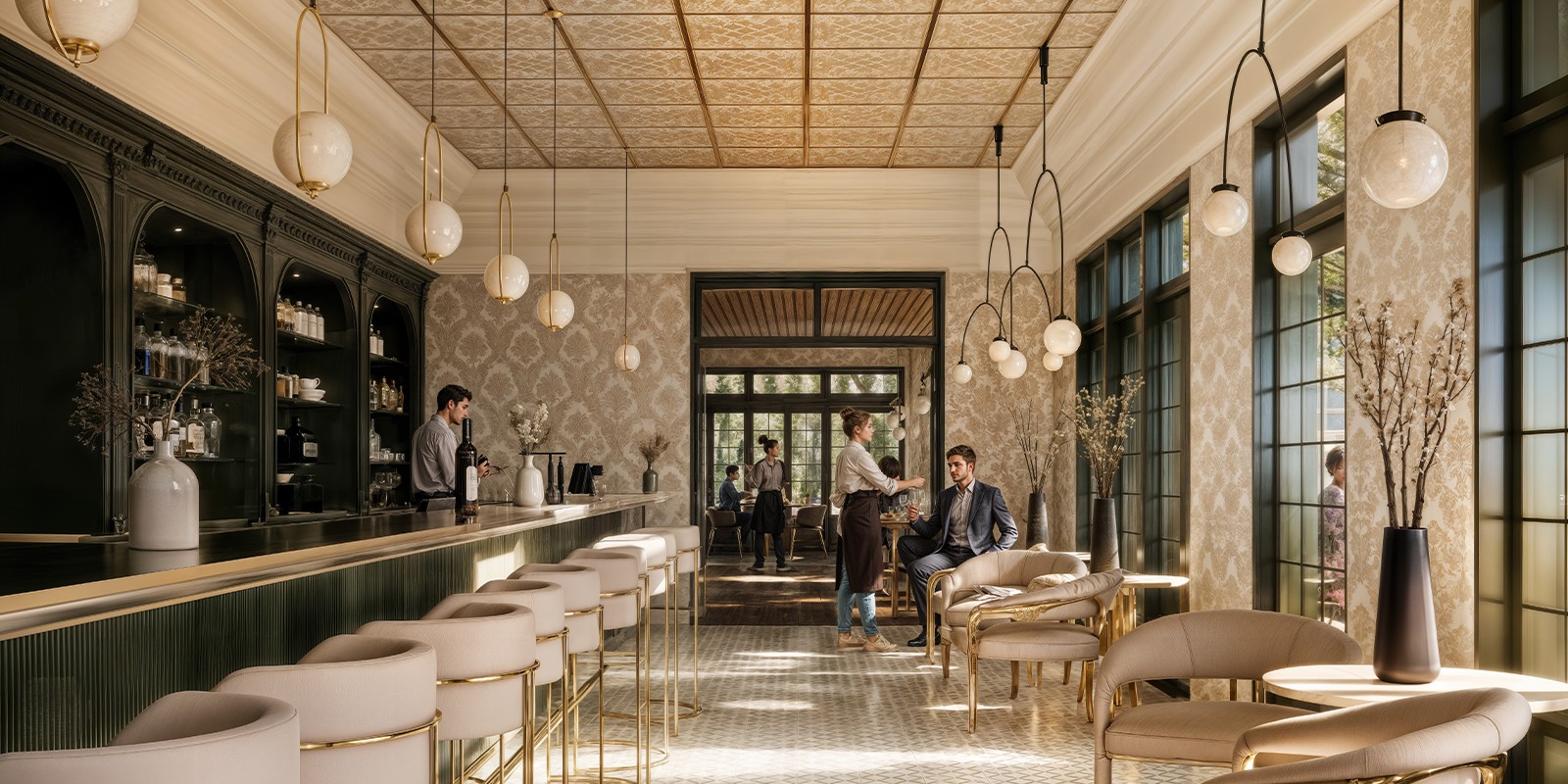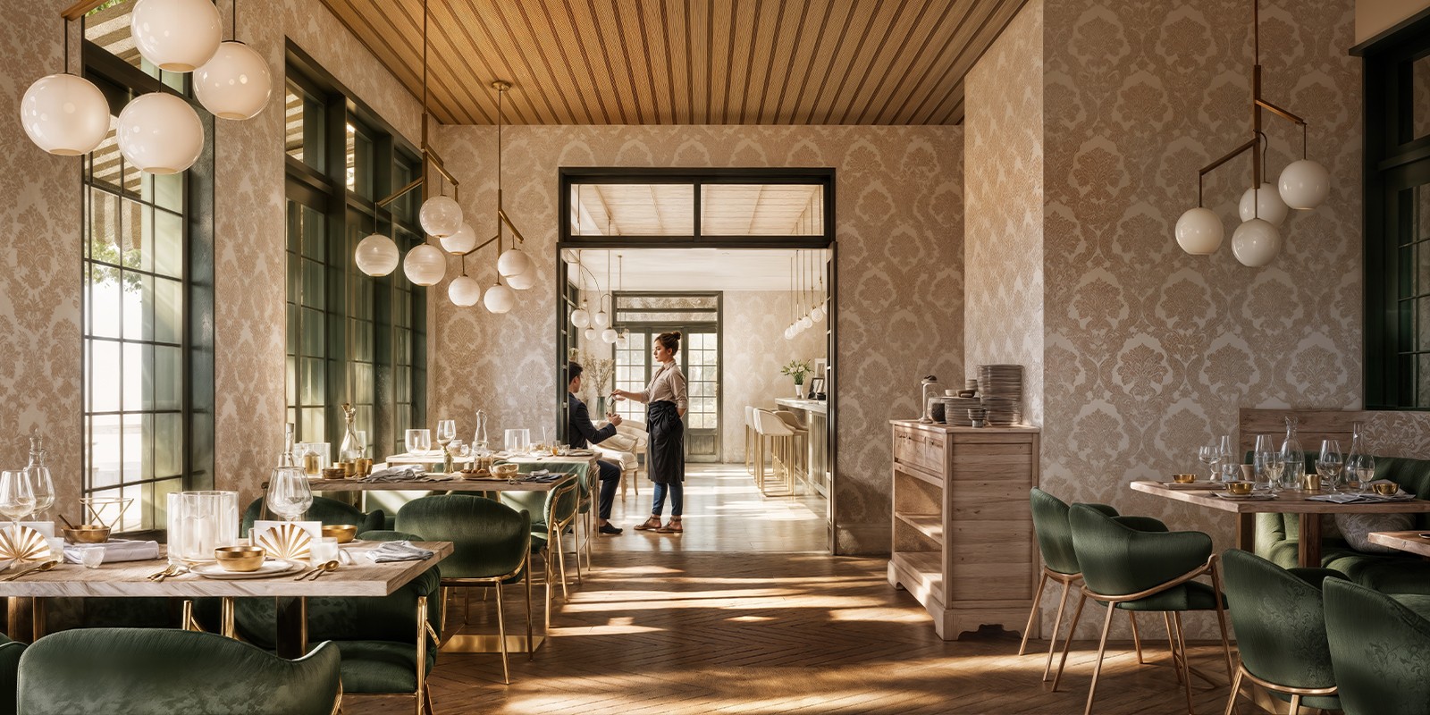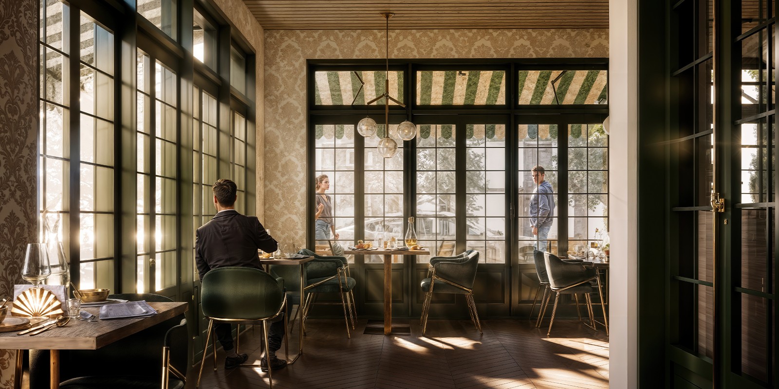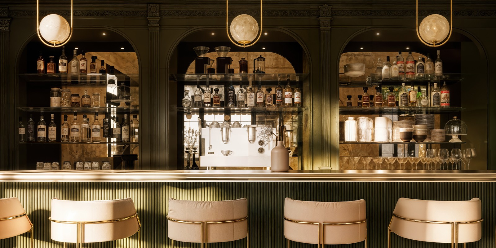 Inside, the atmosphere shifts from animated street life to composed intimacy. Green millwork, brass details, and softly patterned surfaces create a layered backdrop for dining, where light is treated as a material in its own right. The space feels deliberate yet effortless, refined without formality, offering a setting that elevates the everyday into something quietly celebratory.