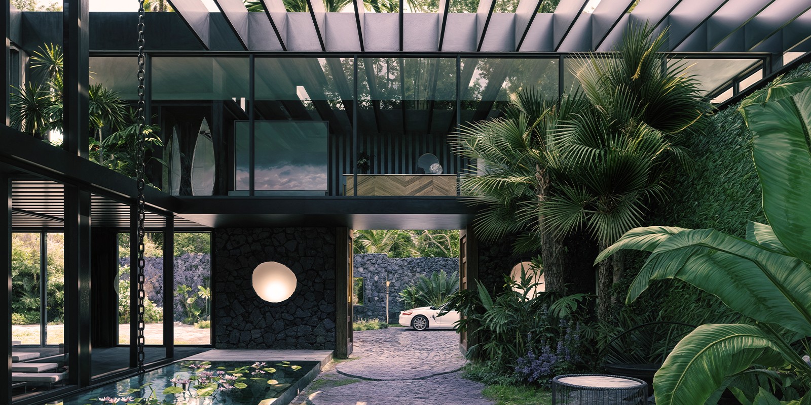 Inside and out blur into a continuous field of courtyards, water rooms, shaded terraces, and long horizontal interiors framed by glass. Open air dining pavilions gaze into thickets of palms, an upper living salon hovers above firelight and stone, and circulation threads through layered gardens that constantly reset one’s sense of orientation. Shadows, reflections, and vegetation define the atmosphere more than the materials themselves. The house feels both intimately protected and completely porous, a place where daily rituals unfold within a choreography of breeze, water, and filtered light. It is architecture not as spectacle, but as an immersive climate, light, air, stone, and canopy held in a state of equilibrium.